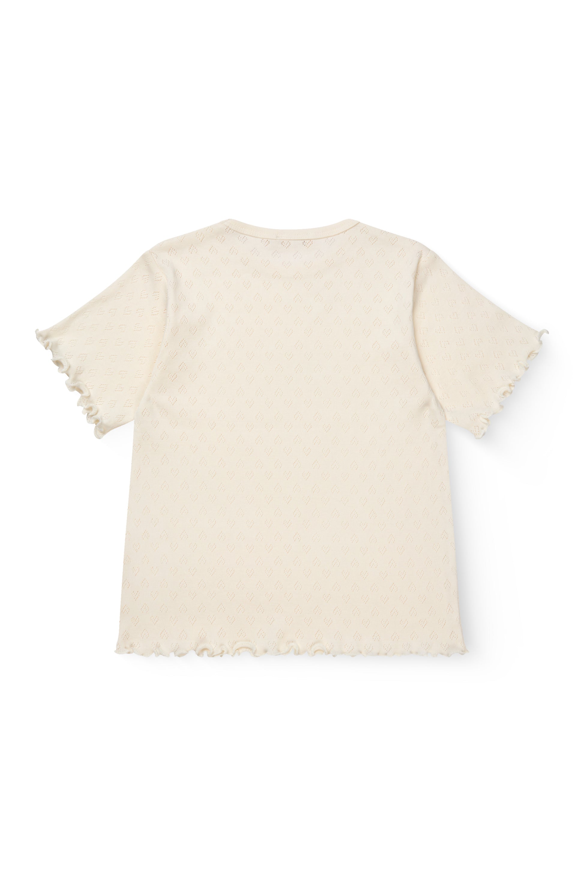 Pointelle tee made in organic cotton. Designed with a short sleeve and a babylock edge at sleeve and bottom hem, for that cute summery look. The light pointelle with the small hearts is made in a super soft jersey quality and comes in 4 different summery shades; cream, light rose, a fresh light yellow and a classic navy. Wash it again and again at 40 degrees and it never loses its shape. No lint and fading colors will be limited. Made in various colors… Of course.